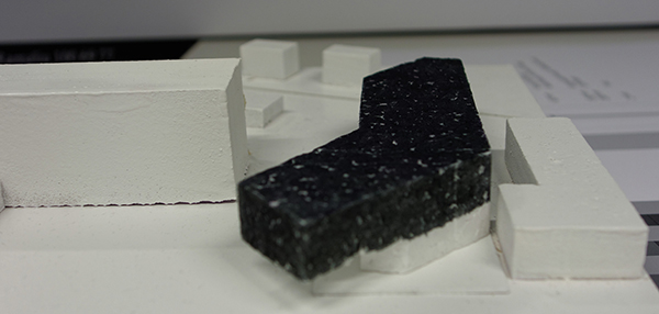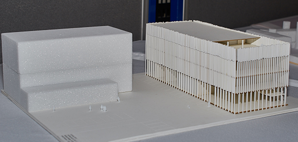 Darüber hinaus wurden zwei Auszeichnungen à 400 Euro vergeben. Eine davon honorierte den Entwurf von Emilisa Kina und Ervin Ramaliu, der für die Jury über die höchste städtebauliche Qualität verfügte. Der neue, anthrazite Einzelbau greift die vorhandenen Achsen geschickt auf und ragt in den vorhandenen Innenhof hinein. Die zweite Auszeichnung erhielt das Projekt „Carthedral“ von Steffen Gruhn, Imke Hansen und Gamze Steiger. Die disziplinierte Durcharbeitung überträgt das vertikale Fassadenraster des Bestandsgebäudes in einer abstrahierten Version auf einen kompakten Neubau aus Faserbeton und schafft so einen stimmigen Gesamtkomplex.