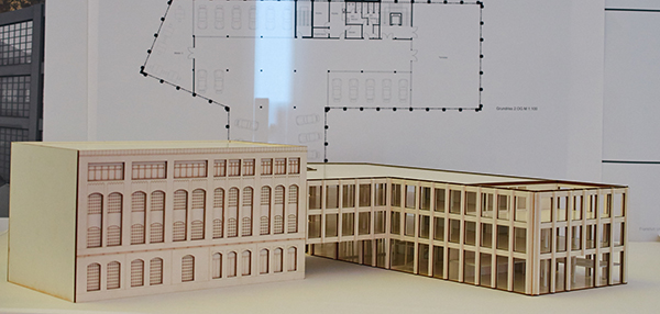 Den mit 1.000 Euro dotierten ersten Preis erhielten Sandra Frischholz und Zimin Hossainy für ihre dunkle Stahlbetonrahmenkonstruktion, die über eine zweigeschossige Brücke an den Bestandsbau anschließt. Der Neubau verfügt über eine Fassade mit großflächigen, seriellen Fensteröffnungen, die helle Innenräume ermöglichen. Für die Jury entspricht diese Arbeit dem industriellen Charakter des Ortes am besten. Zudem verbinde sie Tradition, Innovation und Wirtschaftlichkeit.