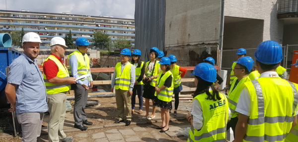 Die Gäste besuchten die derzeit größte ALEA-Baustelle im Rhein-Main-Gebiet, einen 6-geschossigen Wohnungsneubau mit Tiefgarage in Offenbach am Main. Gemeinsam mit dem verantwortlichen Bauleiter Ing. Christof Zimnol und dem Polier Hans Trumpp wurde das Bauvorhaben in Begleitung eines Dolmetschers begangen. Rund 1 Stunde erläuterte Reimann am Beispiel dieser Wohnbaumaßnahme das industrielle Bauen, den Einsatz von Fertigteilen und das Arbeiten mit Spezialbeton. Großes Interesse und viele Fragen gab es zu dem variablen Schalungssystem. Polier Hans Trumpp erläuterte ausführlich den Einsatz von speziellen Einbauteilen, die die Tiefgarage wasserdicht werden lassen. Am Beispiel der Baugrube und der Nähe zum Main führte Ing. Christof Zimnol aus, welche Bedeutung die Wasserhaltung bei einem Projekt haben kann und von welch großer Bedeutung sie beim aktuellen Projekt ist. Beeindruckt waren die Gäste von der Bauzeit der Baumaßnahme, die mit 8 Monaten, auch für chinesische Verhältnisse, als ausgesprochen schnell empfunden wurde.