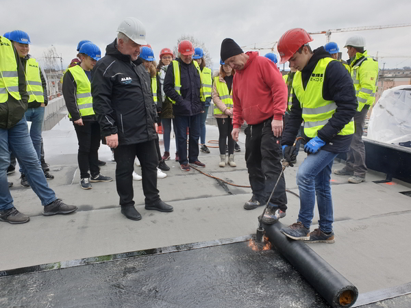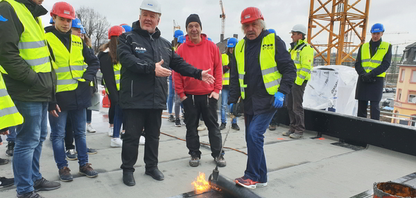 Die Firma GVW Geräte Verleih Wetterau hat, trotz drohendem Schneefalls, junge Menschen mit einer Hebebühne in luftige Höhen mitgenommen. So konnte man sich weit über dem Boden einen Überblick von der Baumaßnahme verschaffen. Ehrengast „Stepi“ , sowie Schülerinnen der Klasse 9aR, legten bei den Dachdeckern selbst Hand an und verlegten Schweißbahnen. „Unser Vorstandskollege Reimann schreibt hier eine Story für junge Menschen, die einen Weg in die Ausbildung suchen“, sagt der 1. Vorsitzende des BDB-HESSENFRANKFURT Andreas Ostermann. „Wir sind hier mit den Schülern in der Baugrube gestartet, haben das Gebäude mit den jungen Menschen wachsen lassen und zeigen jetzt, wie der Ausbau stattfindet. So können die Teilnehmer sich ein perfektes Bild über die verschiedenen Berufe und die damit verbundenen Chancen und Perspektiven verschaffen.“