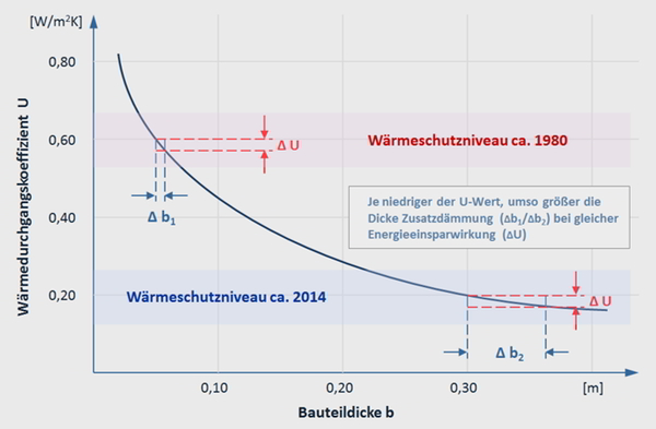 Dieses Parabelfunktion des U-Wertes zeigt, dass der Aufwand überproportional steigt, je niedriger der U-Wert ist, um eine weitere Optimierung der rechnerischen Energieeinsparung zu bewirken.