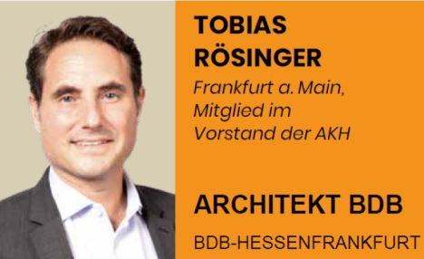 Nach einem großartigen Ergebnis für die Kandidatinnen und Kandidaten des BDB-HESSENFRANKFURT bei der Wahl zur Vertreterversammlung ist deren Spitzenkandidat, Dipl.-Ing. Architekt BDB Tobias Rösinger, wieder in den Vorstand der Architekten- und Stadtplanerkammer Hessen (AKH) gewählt worden.