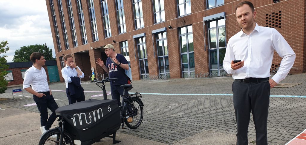 Wie kann Mobilität im Spannungsfeld zwischen Stellplatzsatzung und tatsächlichen Bedarfen neu gedacht werden? Die Vortragenden von Urban Standards in den Räumlichkeiten von Instone Real Estate brachten den interessierten Zuhörern auf dem ehemaligen Fernmeldezeugamtsgelände in Heusenstamm nicht nur eine breitere Sicht auf Mobilität nahe, man konnte auch gleich vor Ort eine Testfahrt mit dem E-Lastenrad oder die kinderleichte Buchung von Parkplätzen via App erleben.