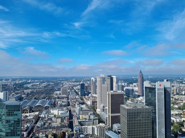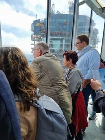 Auf Einladung des BDB-HESSENFRANKFURT ging es dann auf die 198m hoch gelegene Besucherplattform des Maintower, in dem die HeLaBa – Landesbank Hessen-Thüringen – Hauptmieter ist. Von oben war gut der Frankfurter Hauptbahnhof und das nahe gelegene Hotel zu sehen, in dem die Kollegen aus Leipzig in Frankfurt Unterkunft bezogen haben.